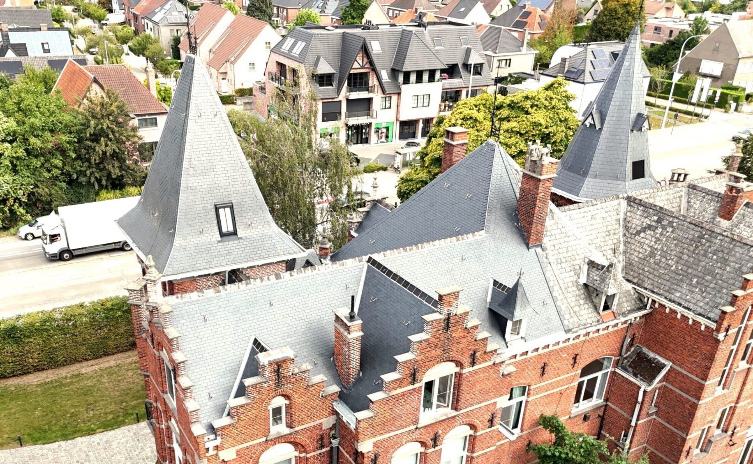 Vervolgens werd een nieuw onderdak geplaatst. Ook de afwatering werd volledig vernieuwd met metalen afvoerbuizen, zinken bakgoten, kilgoten en aangepaste aansluitingen aan de schoorstenen en gevels. Diverse dakdoorvoeren en loodafwerkingen werden nauwkeurig geïntegreerd. Er werd gekozen voor dakbedekking met natuurleien Cupa 4 Vlaams model, omdat dit kwalitatief en duurzaam is.