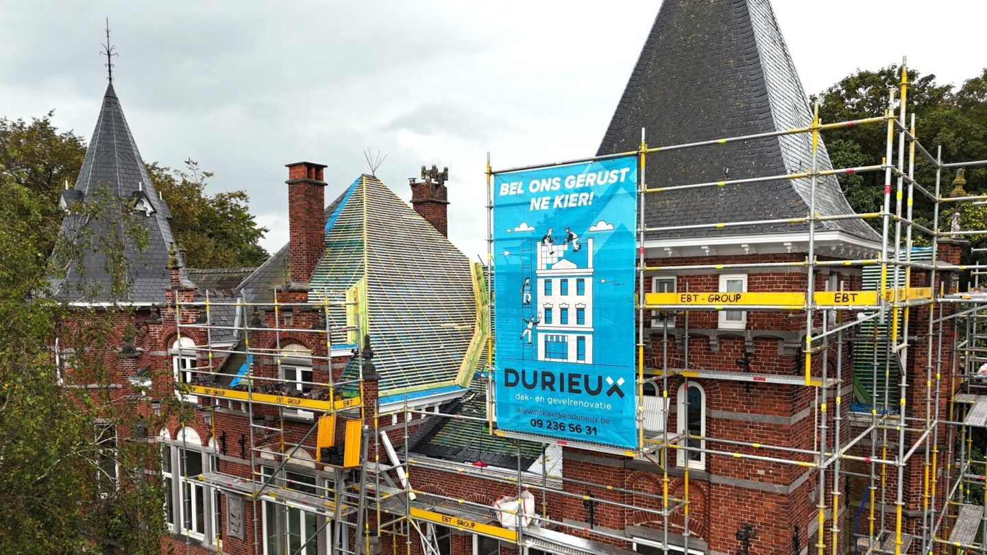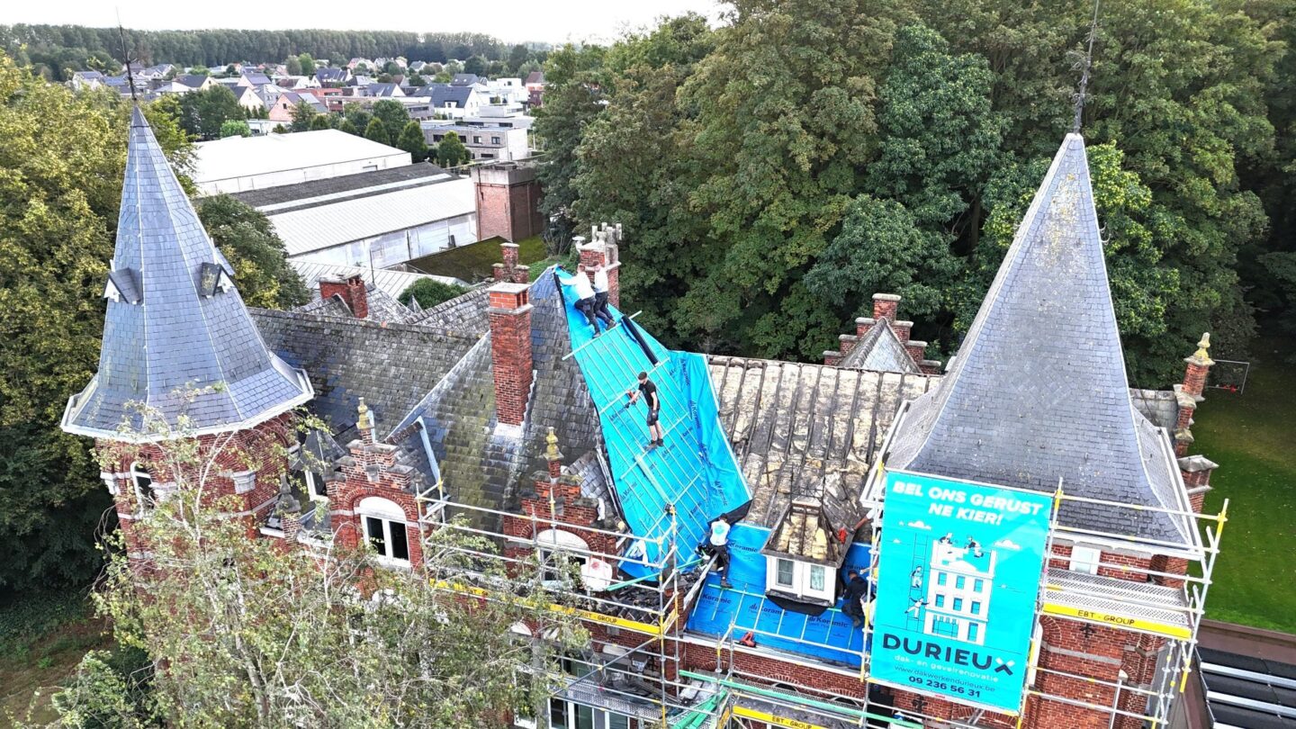 Durieux kreeg de opdracht om de helft van het kasteel in Lochristi grondig te renoveren. Eerst werden alle bestaande leien, goten, kilgoten en andere dakcomponenten zorgvuldig verwijderd.