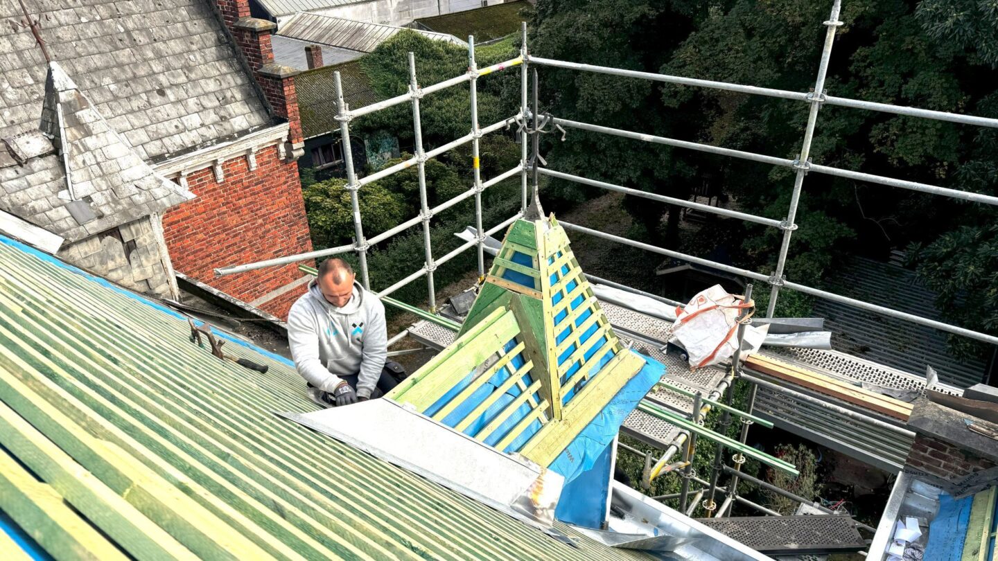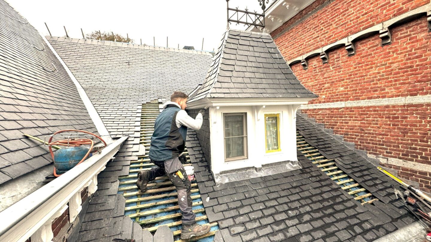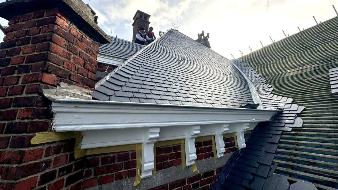 Aanvullend voerde Durieux herstelwerken aan de dakstructuur uit, inclusief timmerwerk waar nodig. Bepaalde houten elementen en raamkaders werden geschuurd en geschilderd, net als de bakgoten, windveren en geveldetails. Daarnaast werd ook de loden waterkering aan de dakkapellen vernieuwd door het Durieux-team.
