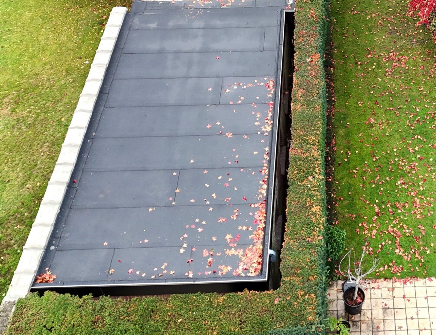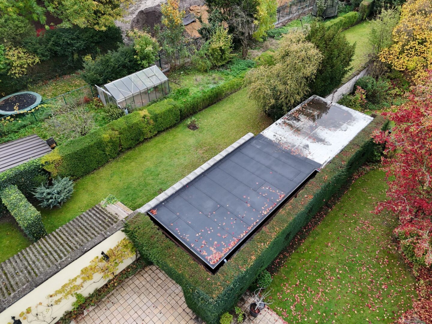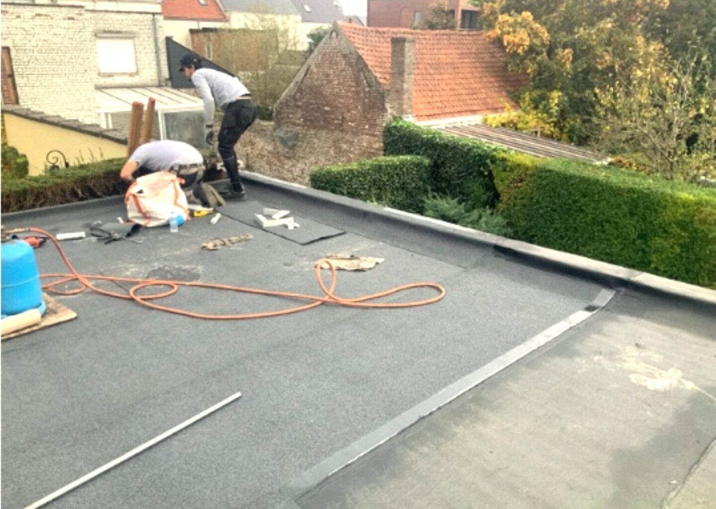 Om het comfort en het binnenklimaat te verbeteren, werden nieuwe Velux-dakramen geplaatst, die zorgen voor extra daglicht en ventilatie op de bovenverdieping. Het plat dak van de garage werd eveneens gerenoveerd met een duurzame roofing-afwerking.